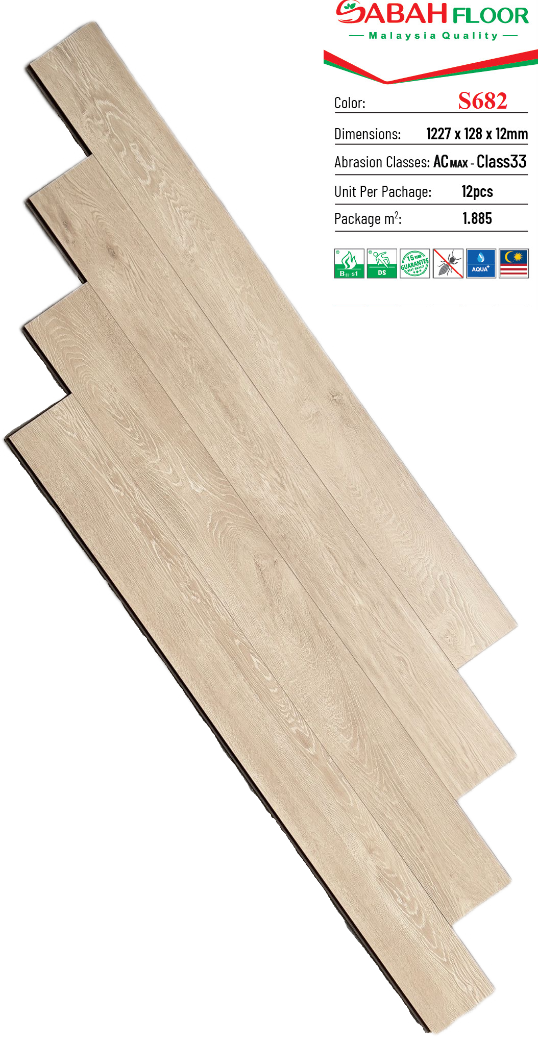 - Sàn gỗ Sabah được trang bị lớp giấy đế cân bằng màu nâu cao cấp, giúp cho thanh gỗ không bị cong, tăng cường khả năng chống nước.