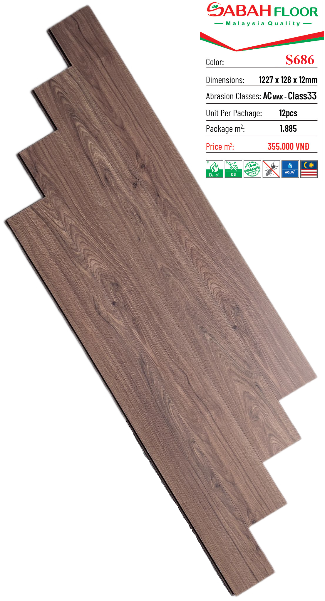 Sàn gỗ Sabah S686 với tông màu chiu liu, thích hợp với những gia chủ cá tính mạnh mẽ, thích sự độc đáo. Không chỉ đơn thuần là màu tối, vân gỗ điểm những vệt hơi sáng màu làm giảm đi sự đơn điệu. Sabah S686 phù hợp với những không gian nội thất thiết kế theo kiểu trắng đen – xưa và nay, là sự lựa chọn của những kiến trúc sư tài hoa, đơn giản mà quý phái.