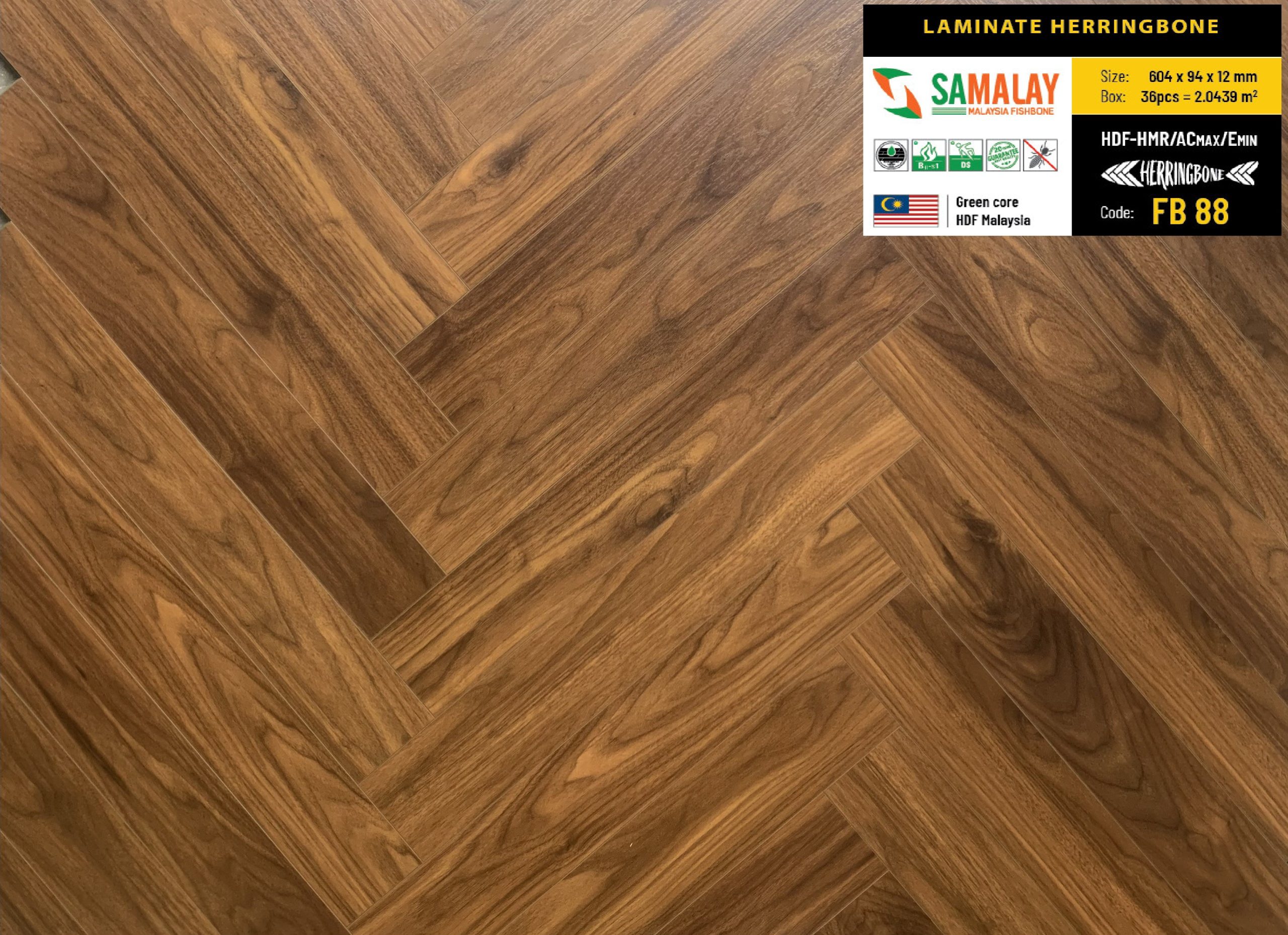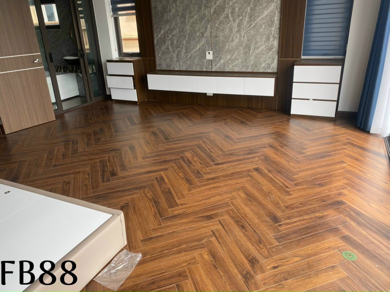 sàn gỗ xương cá Samalay Fishbone FB88 với tone màu gỗ óc chó truyền thống, phù hợp với phong cách tân cổ điển, tông màu tối khỏe khoắn phối hợp với đồ nội thất màu trắng làm ngôi nhà thêm hiện đại và cá tính
